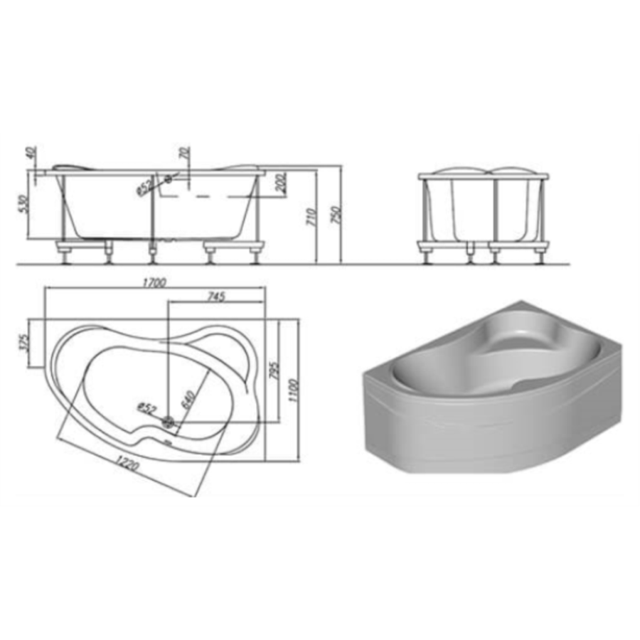 Акриловая ванна Kolpa-San Lulu 170х110 L белая, с каркасом и сливом-переливом