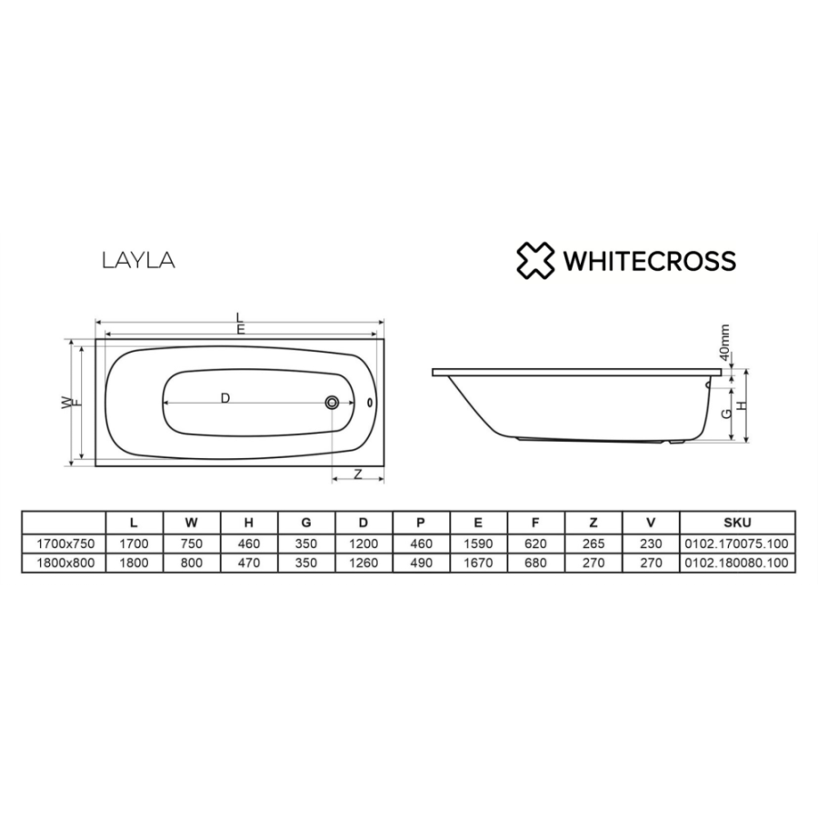 Акриловая ванна Whitecross Layla 170х75 белая, без каркаса