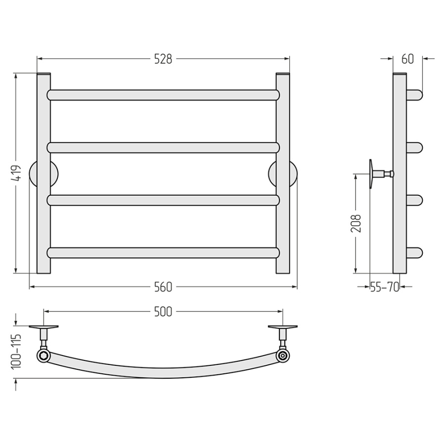 Полотенцесушитель, кронштейн телескопический, спускной клапан, заглушка. для подключения потребуется: два соединительных элемента угловых/прямых.