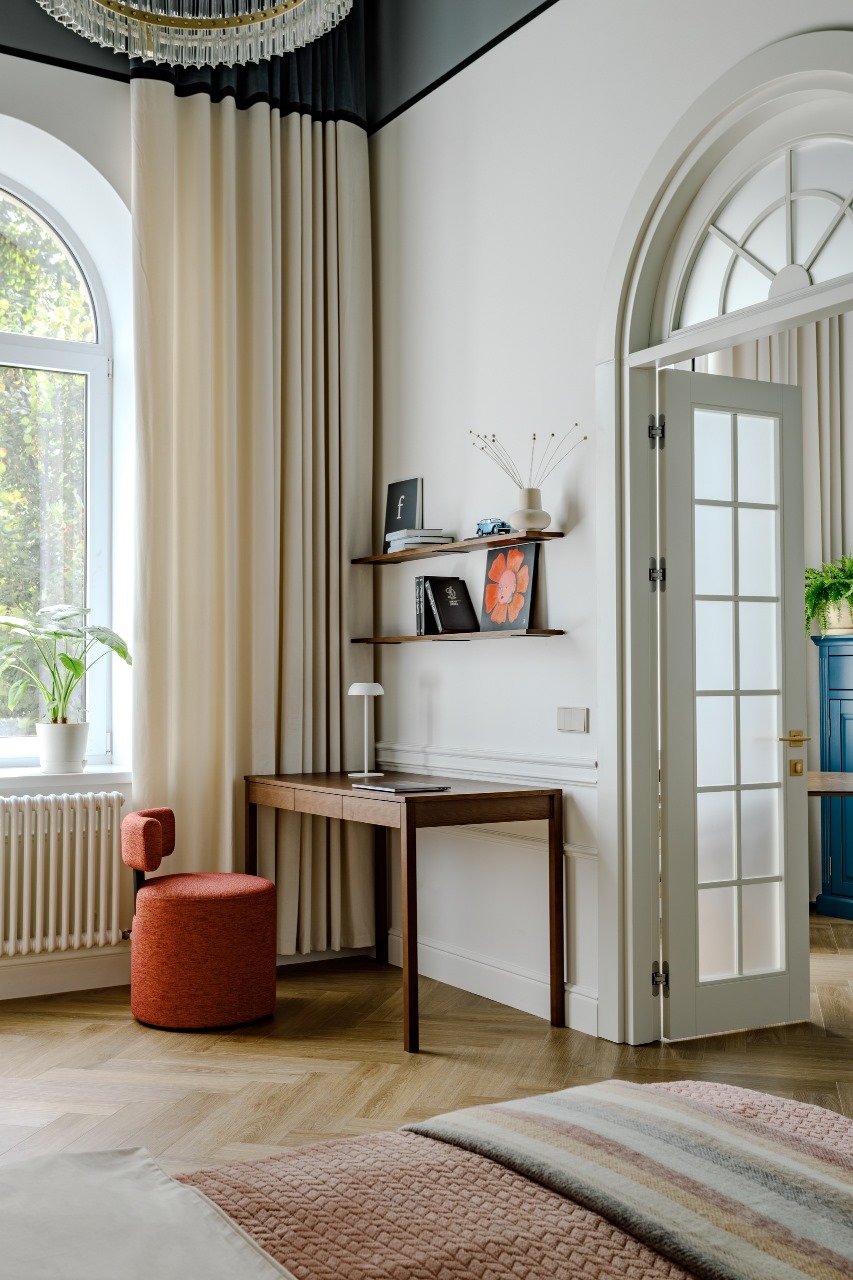 В спальне расположились кабинет с удобной библиотекой, и просторная гардеробная с постирочной.