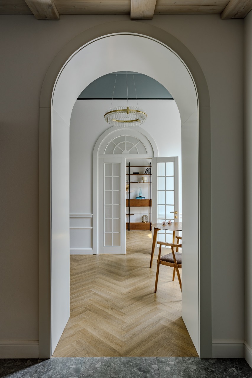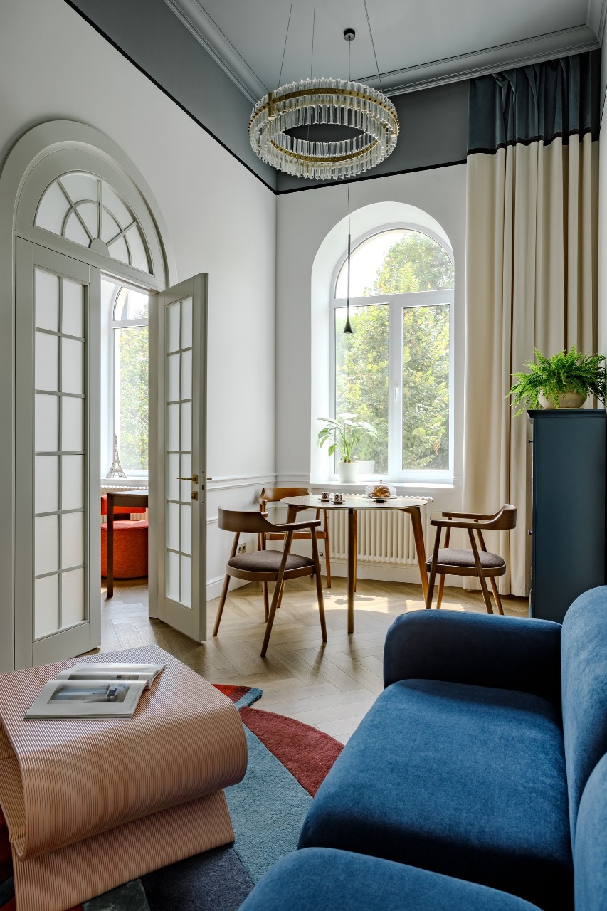 Досталась нам в полуразрушенном виде. Заказчик приобрел этот объект не для постоянного проживания, чтобы останавливаться на выходных, для гостей друзей и родственников. В проекте он хотел увидеть немного французской классики, немного пражского стиля, так как долгое время жил и учился в Праге. Также хотел добавить современного и скандинавского комфортного для жизни дизайна.
